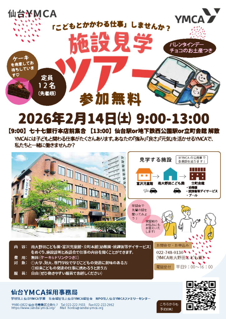 内容:南大野田保育園・富沢児童館・立町本館(幼稚園・放課後デイサービス)をめぐり、施設説明と茶話会で仕事の内容を聞くことができます。